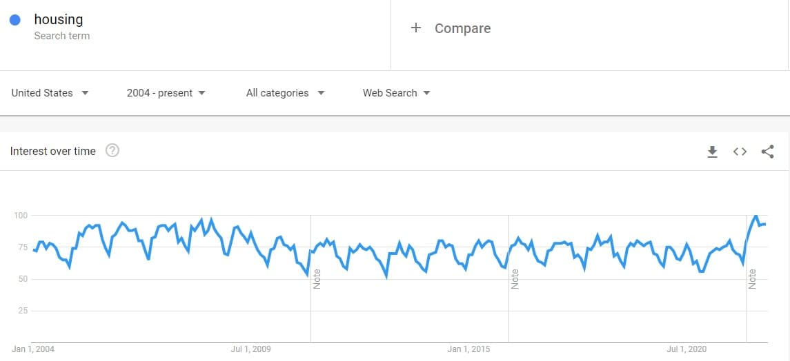 We’re going to look at a few different factors here. First the search terms. Google analytics show that within the US, people searching for housing is relatively stable and fluctuates cyclically generally peaking in the summer and waning in the winter. Nobody wants to move in the middle of a snow storm. Not surprisingly, there were two peaks in people searching for housing, just before the 2007/08 housing market crash, and March of 2020 when people looked for new places where they could escape the pandemic.